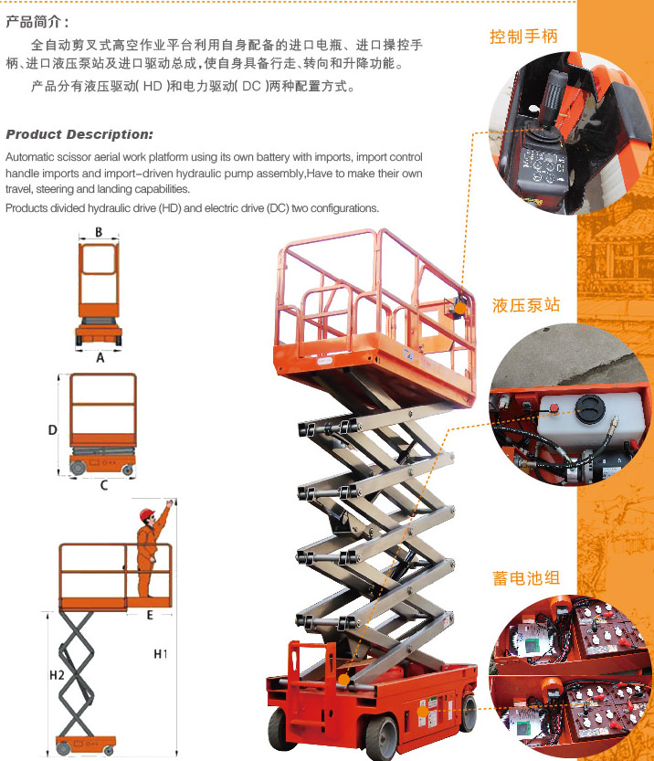全自動(dòng)剪叉式高空作業(yè)平臺(tái)利用自身配備的進(jìn)口電瓶、進(jìn)口操控手柄、進(jìn)口液壓泵站及進(jìn)口驅(qū)動(dòng)總成,使自身具備行走、轉(zhuǎn)向和升降功能。